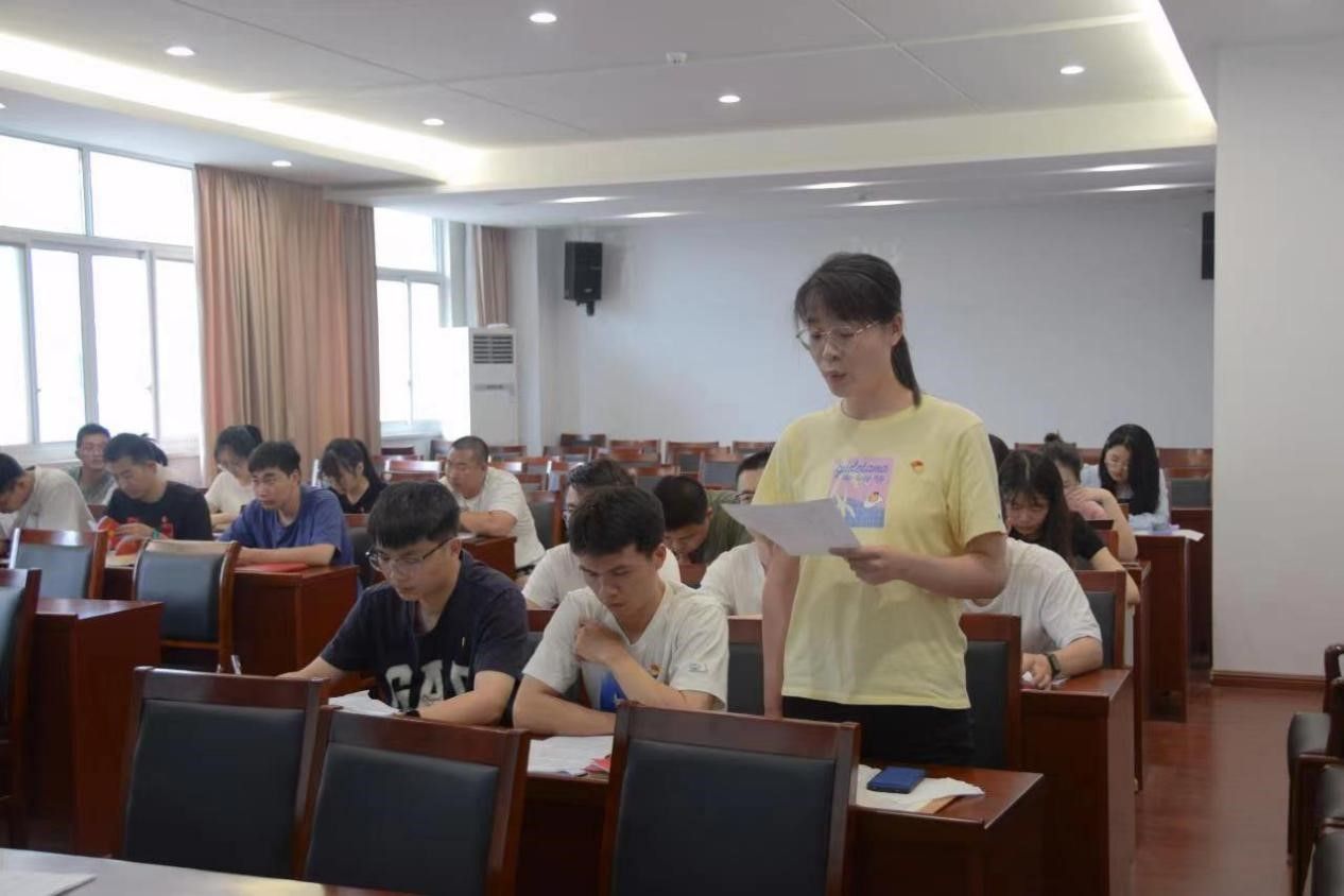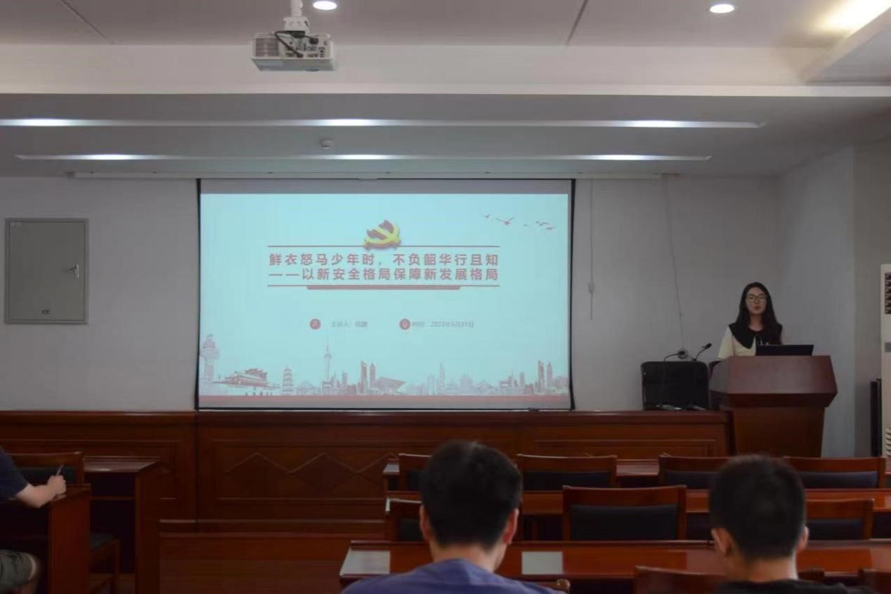 首先,党支部书记钱露同志围绕“以新安全格局保障新发展格局”主题讲授学习贯彻习近平新时代中国特色社会主义思想主题教育专题党课,就习近平总书记提出的总体国家安全观的概念、范围和重要性等内容进行了讲解。同时对青年学生践行总体国家安全观提出了三点具体要求:一是政治安全入心,筑牢国家利益生命线;二是网络安全入脑,守护个人利益主阵地;三是生产安全入行,搭建社会发展智力库。