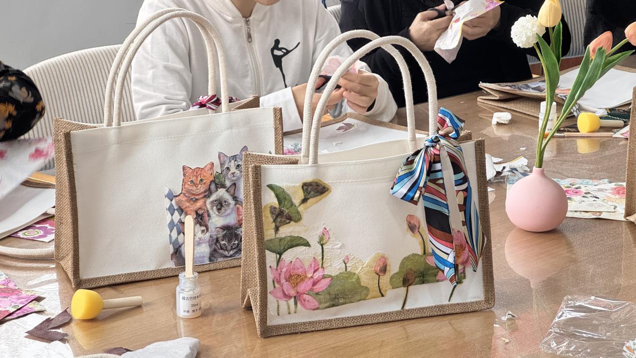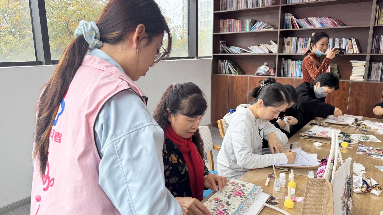 活动现场,同学们分组协助居民进行手提包制作,从布料裁剪到针线缝合,从装饰点缀到成品定型,每一个环节都有学生志愿者细致讲解、耐心辅助。面对老年居民在操作中的实际困难,同学们开展一对一帮扶,手把手指导针法技巧,贴心协助完成制作。居民们根据个人喜好自由搭配材料,在轻松愉悦的氛围中交流制作心得,展示创意成果。原本素净的布料经过大家的巧手改造,变成了一件件独具个性、实用美观的手提包。整个活动现场洋溢着温馨与欢笑,展现了校社联动、代际融通的生动画面。