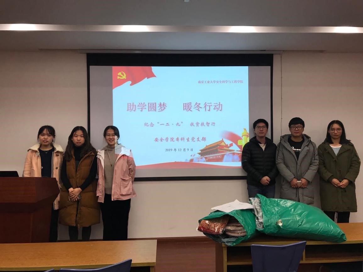 接着,开展本年度的“暖冬行动”启动仪式。本科生第一党支部书记杨子昕向大家通报了前期物资购买、经费使用情况以及活动后续规划,介绍了受资助同学们的基本情况。学院本科生党支部为四川省黄丹小学、黄丹中学的孩子们送去过冬物资,同时,以“扶贫要扶智”为目标,为当地小学学生们额外购置了安全教育读本,积极推动建设温暖校园、助力保障校园安全。