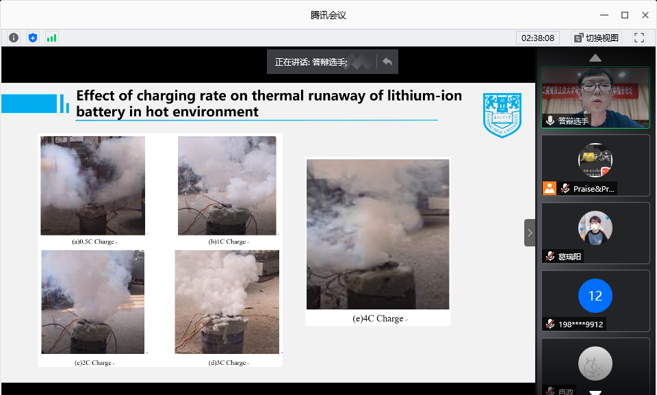 受疫情影响,本次活动以线上形式(腾讯会议)举行,分论坛共设五个小组,各组选手依次对自己的研究成果进行PPT展示,内容涵盖了锂电池安全、化工过程安全、新型阻燃材料研发等各个方向。评委老师在认真听取每位同学汇报的基础上,根据整体表达、课题评审、互动环节等方面依次进行打分和点评,并有针对性的提出了问题和建议,在指出文章不足之处的同时给出了建设性的修改意见。现场气氛融洽,师生之间积极互动,学术氛围浓厚。经4个多小时的答辩评审,本次分论坛取得圆满成功。