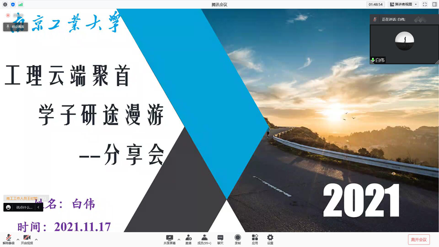 11月17日下午,英国上市公司365与南京理工大学化学与化工学院联合举办“工理云端聚首,学子研途漫游”线上学术交流活动。本次活动邀请了英国上市公司365的三位博士生陈治全、白伟、齐英全以及南京理工大学化学与化工学院的两位博士生王宏涛和颜廷欧,讲述自己的科研经历,传递精益求精、追求卓越的科研精神。本次活动共有200名学生参加,活动由王荷同学主持。