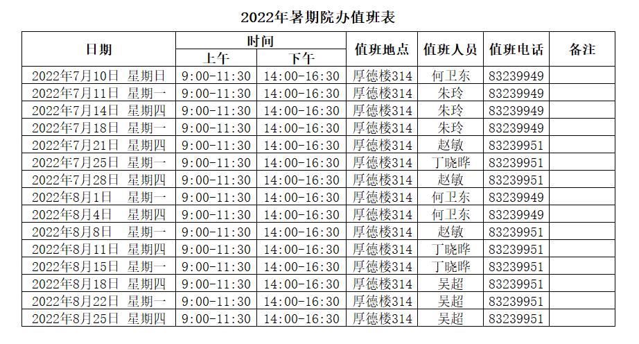 2022年暑期院办值班安排