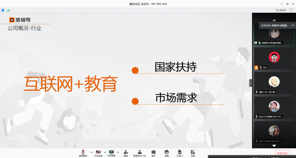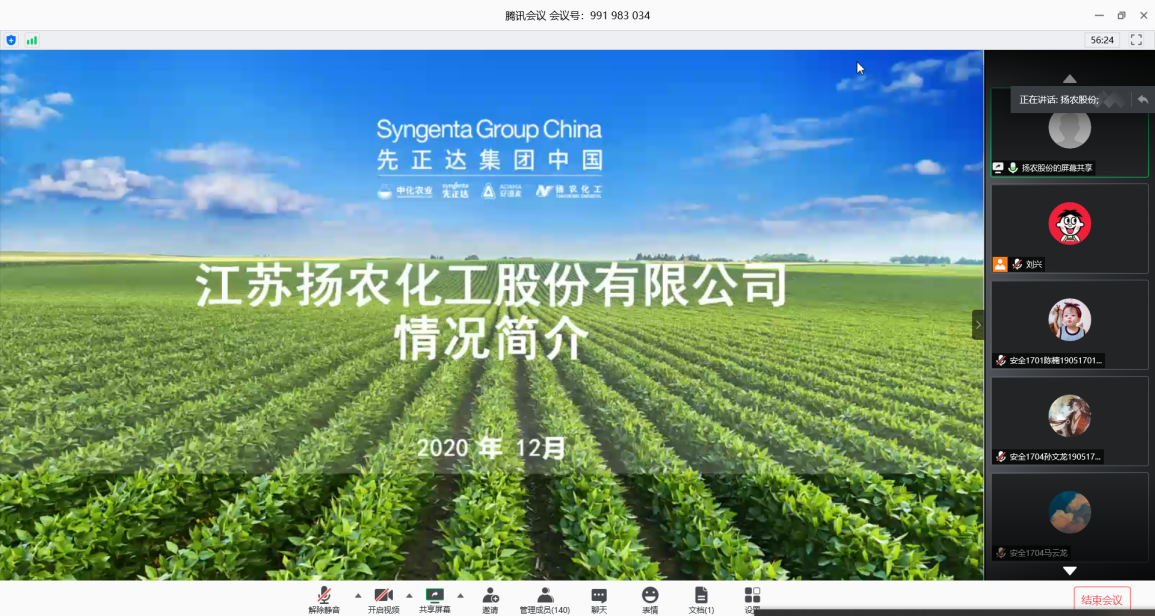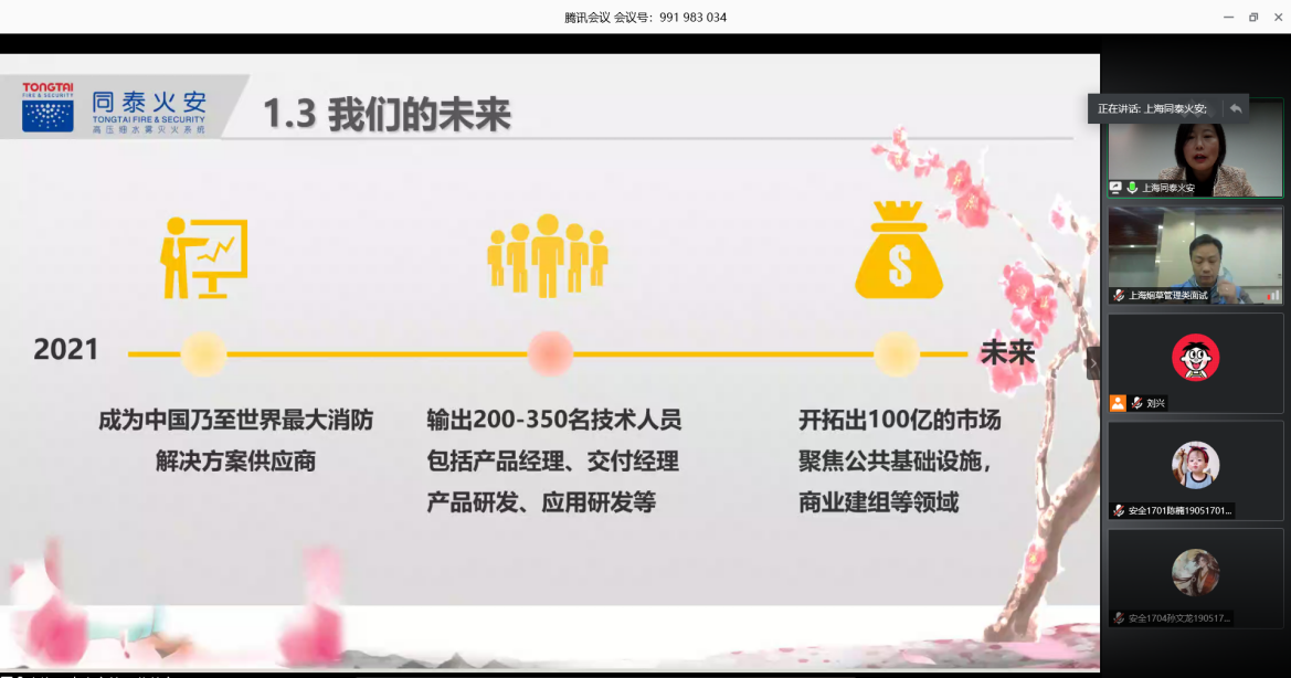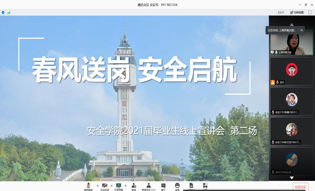 3月31日下午,安全学院通过“腾讯会议”网络平台召开了“春风送岗,安全启航”安全专场网络宣讲会(第二场)。本次会议邀请了上海同泰火安科技有限公司、上海烟草集团太仓海烟烟草薄片有限公司、南京馨荣检测技术有限公司、江苏扬农化工股份有限公司、中国铁路南昌局集团有限公司、猿辅导南京分公司六家企业进行宣讲,辅导员王茜老师及全体17级学生参会。