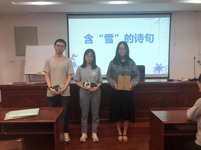 本次大会分为团体赛和个人赛,共设有诗词填空、诗句九宫格、你画我猜、飞花令四种题型。经过团队赛的激烈角逐,共有2组,6名参赛队员从13组参赛队伍中脱颖而出,进入飞花令个人赛阶段。飞花令决赛段的比拼在许云婷和张元杰之间展开,战况尤为激烈,选手反应速度之快,知识储备之丰富,无不让在场的同学们叹服。经过三轮比赛,许云婷、张元杰以及戚荣花同学分别获得本次诗词大会的冠军,亚军和季军,李佳、何弘鹏、翟颠颠同学获得四等奖。