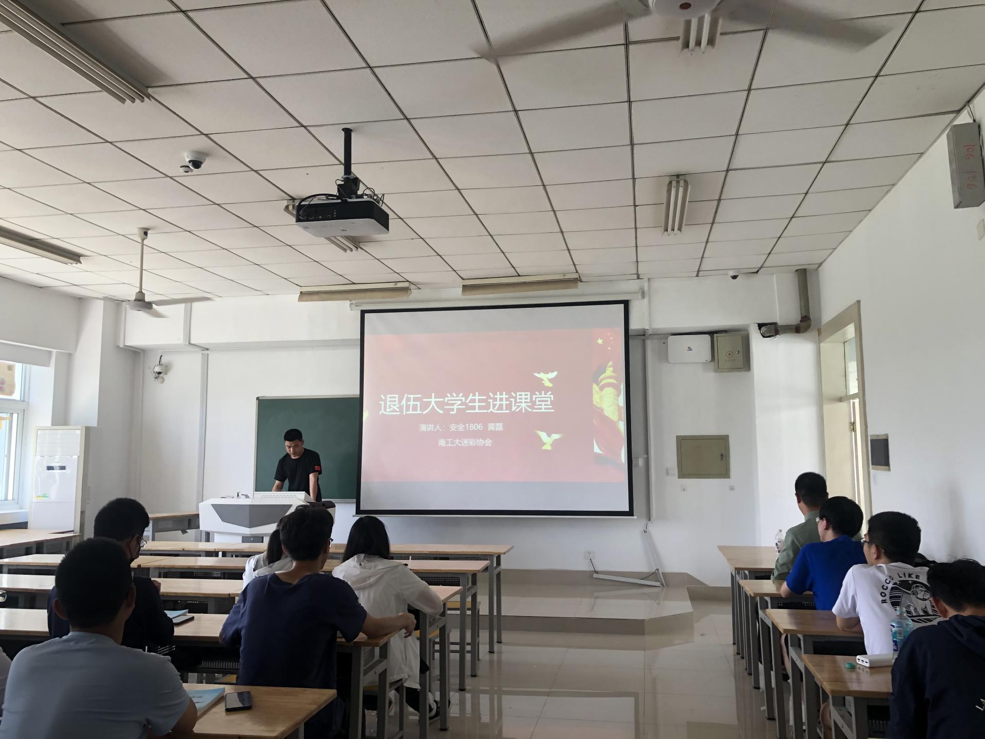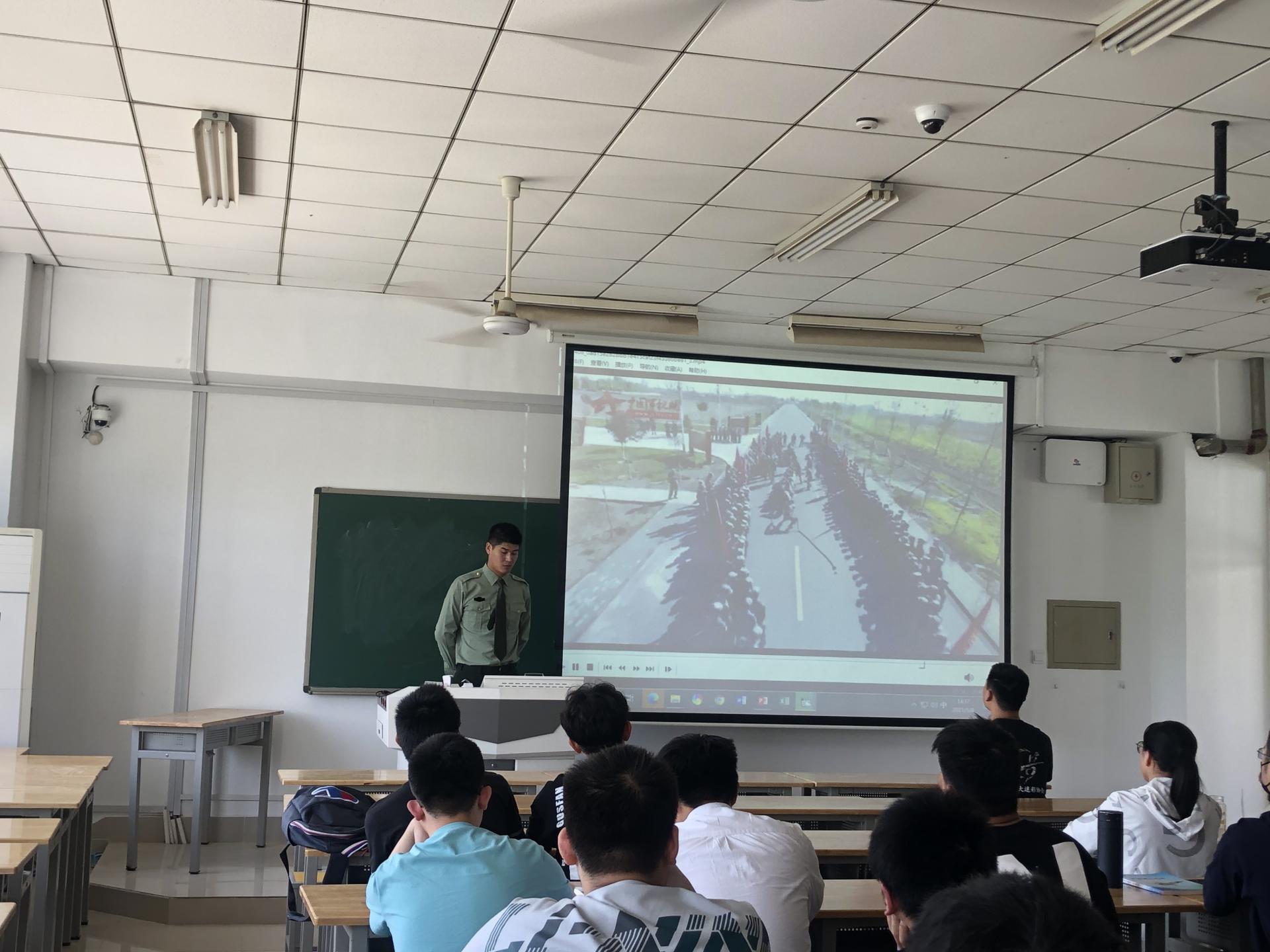 5月8日,安全学院举办“退伍大学生士兵进课堂”宣讲活动,邀请2名退伍大学生走进课堂,讲解征兵政策,分享军旅生活。安全学院辅导员乐平老师以及100多名学生代表参加了此次宣讲会。