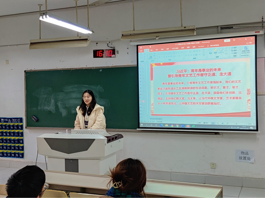 会上,院研究生会文体部邓丽莎同学领学了《深入实施新时代人才强国战略,加快建设世界重要人才中心和创新高地》,她从全面贯彻新时代人才工作新理念新战略新举措、加快建设世界重要人才中心和创新高地、深化人才发展体制机制改革、加快建设国家战略人才力量、全方位培养引进用好人才五个方面介绍党中央新时代人才强国战略的重大部署,号召大家深怀爱国之心,砥砺报国之志,主动担负时代的责任与使命。院研究生会文体部刘佳妮同学领学了《习近平在中共中央政治局第三十五次集体学习时强调坚定不移走中国特色社会主义法治道路,更好推进中国特色社会主义法治体系建设》,她紧扣中国特色社会主义法治建设主题,提出青年要以自己的实际行动响应国家号召,要理解法律、敬畏法律、践行法律。