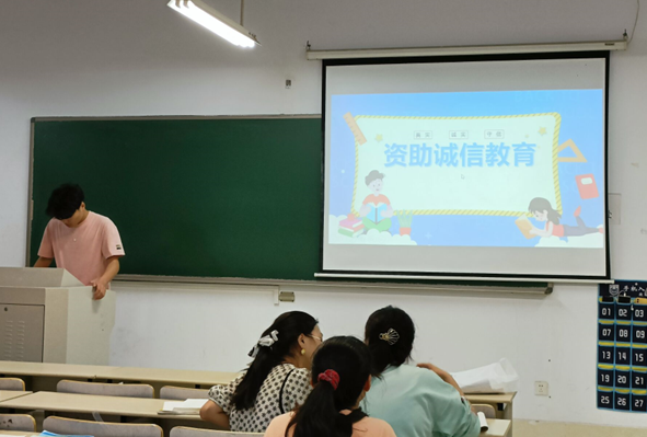 会上,各班负责人向班级同学解读了国家和学校的学生资助政策相关文件,并向同学们系统介绍了国家资助政策,让他们了解包括奖学金、助学金、国家助学贷款、勤工助学、特殊困难补助、学费减免、学费补偿和绿色通道等多元融合的助学体系。同时通过部分反面典型案例,警示同学们正确认识弄虚作假、诚信缺失的恶劣影响及严重后果,争做诚实守信的文明大学生。会后,辅导员王茜老师对各班级班会开展的情况进行了点评,她指出了进一步深入了解资助政策,认识诚信贷款、诚信做人的重大意义,并鼓励同学们要自立自强,知恩感恩,增强当代大学生的使命意识和责任担当,争取在青春赛道上跑出自己的最好成绩。