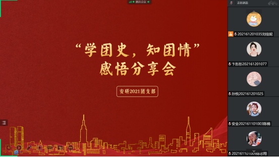 为庆祝中国共产主义青年团成立100周年,引领青年为国家发展奋斗担当。5月30日,安研2021级团支部线上开展“学团史,知团情”活动,诵读百年团史,传承红色基因,勇担青春使命,追寻信仰之光。