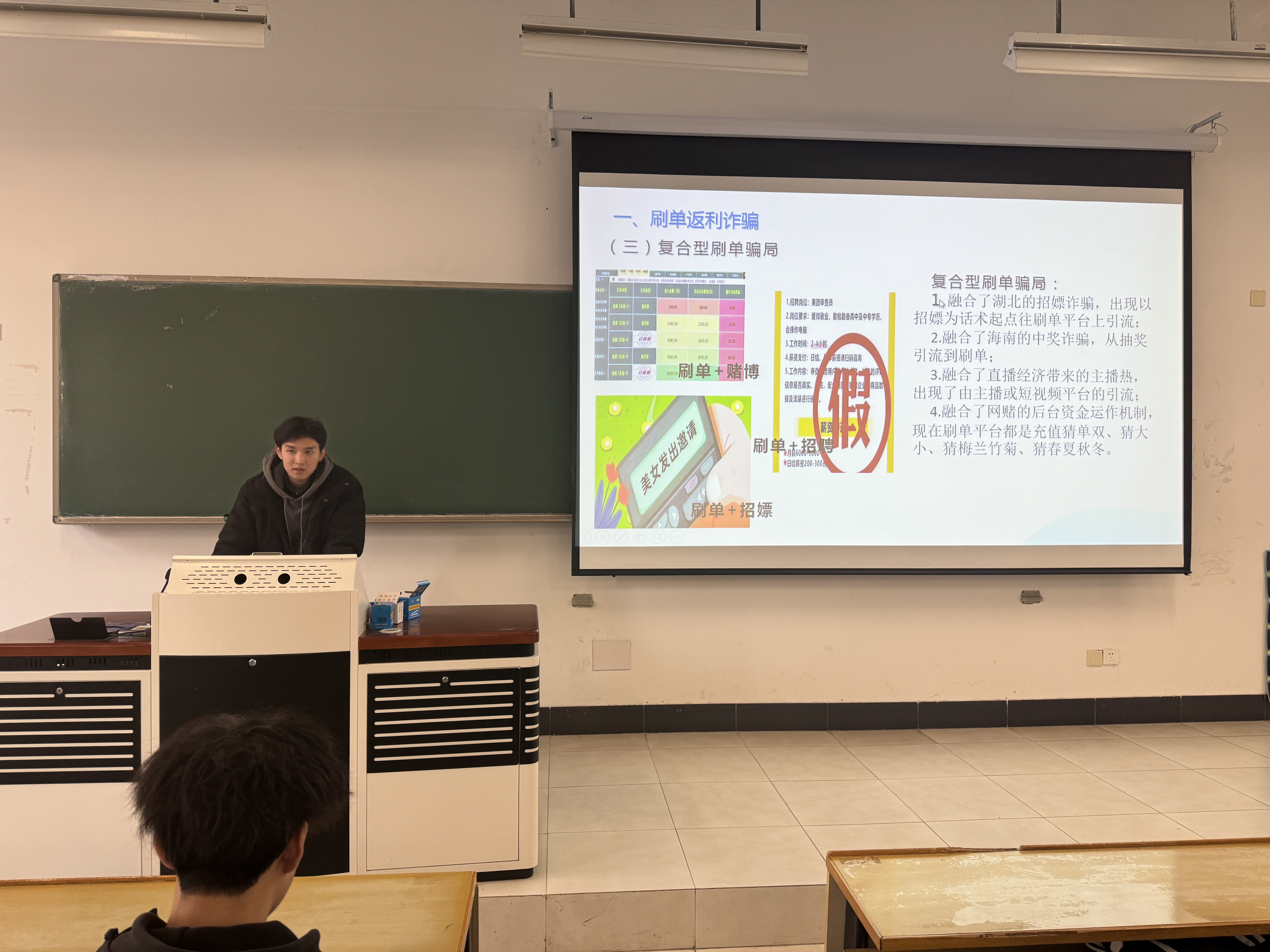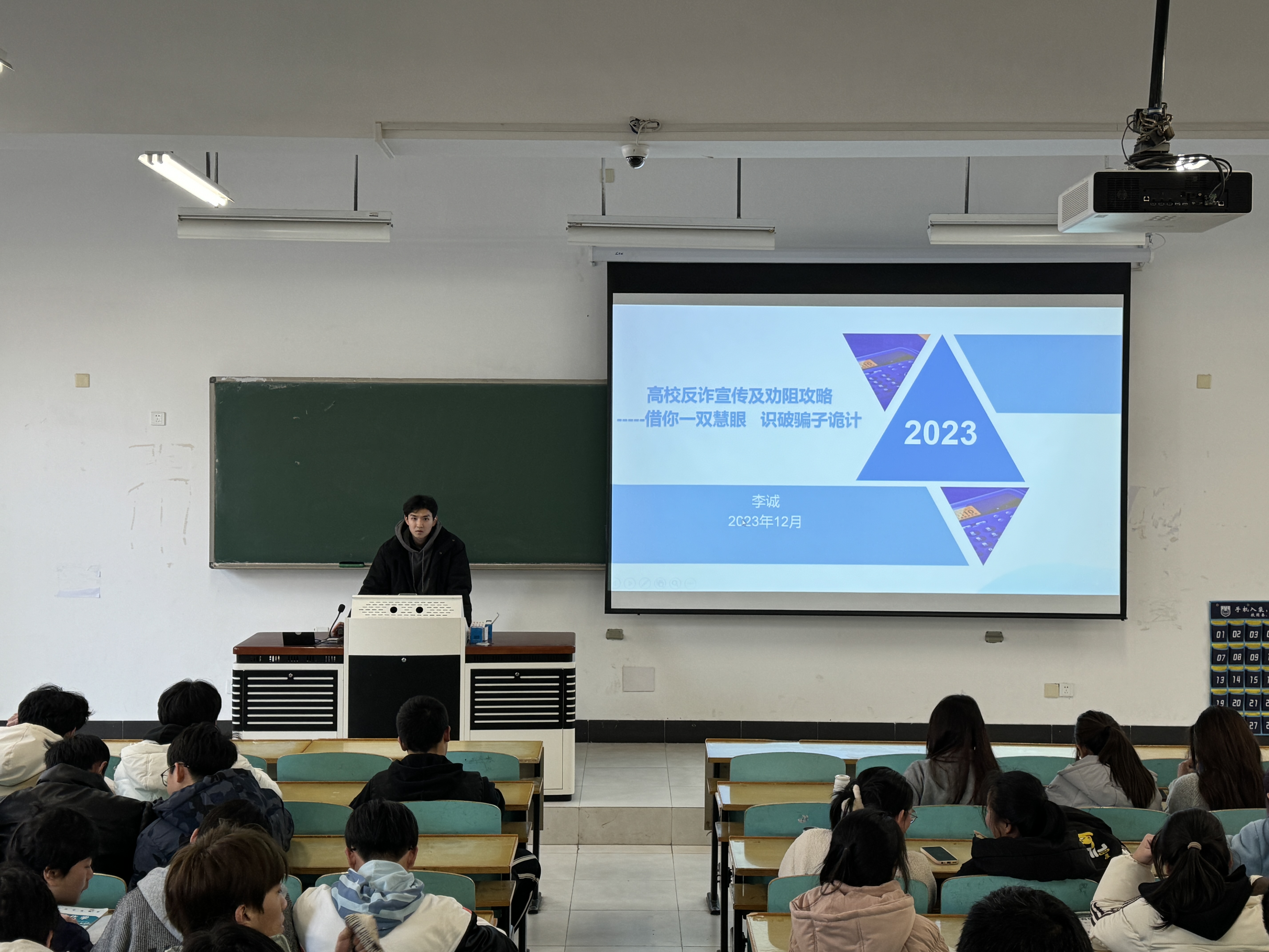 会议伊始,李诚老师用校园案例引入反电诈主题,分析当前电信网络诈骗形势,特点以及作为当代大学生该如何应对。其次,通过典型案例,介绍诈骗套路手法和预防补救措施,详细介绍了刷单返利、虚假网络投资理财、冒充电商物流客服、虚假贷款、虚假征信、虚假购物服务、冒充领导熟人等特定身份、网络游戏产品虚假交易、冒充公检发及政府机关,裸聊这十种高发的网络诈骗类型。最后,李老师讲述了反诈中心开展电信网络诈骗预警劝阻的方式方法,提醒同学们要重视电信网络诈骗,不能掉以轻心。