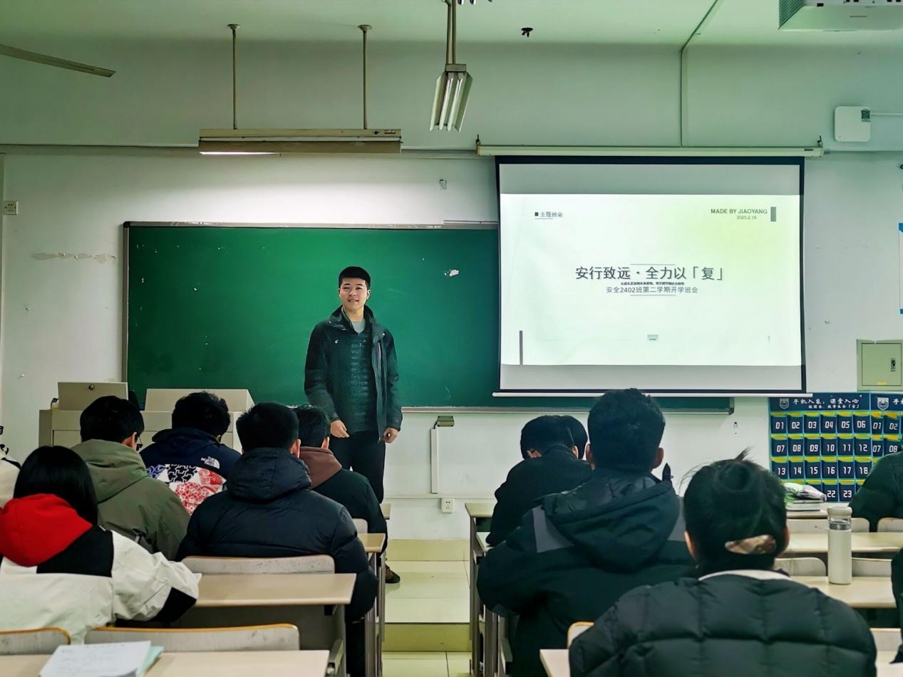 新学期伊始,为引导同学们形成开拓进取、积极向上的良好精神面貌,明确班级建设目标与计划,加强班级文化建设,激发班级活力,2月18日,安全2402班开展了新学期主题班会。本次班会由安全2402班班长焦扬主持,助理班主任王子鹏及班级全体同学参加。