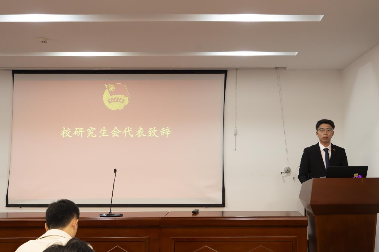第一次全体会议在庄严的国歌声中隆重拉开帷幕。校研究生会代表江荣坤同学充分肯定了我院上一届研究生会的工作成效,同时寄语新一届研会,要传承优良传统、勇于开拓创新,为广大研究生群体谋取更多福祉。